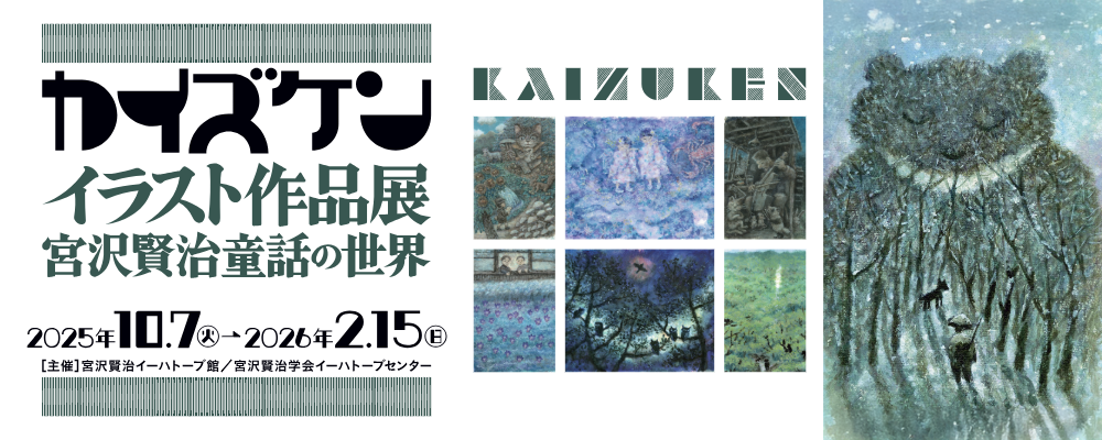 宮沢賢治イーハトーブ館展示場にて、「カイズケン イラスト作品展 宮沢賢治童話の世界」を行います。 カイズケンさんによるイラストをパネル展示いたします。 今回は特別に、原画一点とアニメーション素材も展示しております。 […](掲載)宮沢賢治学会イーハトーブセンター功労賞が決定しました